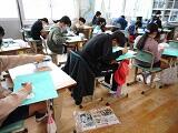 各学年では2学期に勉強した内容のまとめにも入ってます。6年生では、それぞれの選んだ座右の銘と選んだ理由をまとめたものを2,3人で交換して互いに感想を伝えていました。ちょっと覗いてみると知らない言葉があったり、お父さんから言われた言葉を選んだりと、自分の言葉でまとめることができているようでした。3年生は、自分で作ったお話を画用紙にまとめていました。文章を考えて、それに合わせたイラストをWeb検索して一生懸命仕上げていました。出来上がりが楽しみですね。