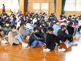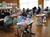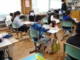 3時間目は図工をしている学級が多く、2年生は粘土、5・6年生は版画制作に取り組んでいました。6年生の黙々と作品づくりに取り組む姿が印象的でした。1年生は体育館で長縄をVの字に広げてジャンプ運動をしていました。だんだん幅が広がる2本の縄を楽しみながら跳び越えていました。4年生は冬休みの図書を借りた後、先生が教師に戻ってくるまで静かに待つことができていました。