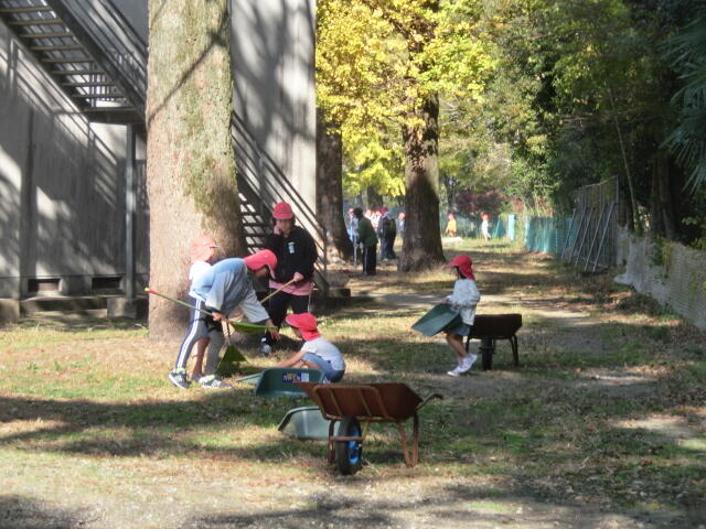 児童は、異学年の班ごとに分かれて、落ち葉を拾います。上学年が下学年に優しく指示を出しながら、手際よく作業を進めます。