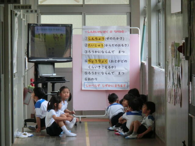 最後に1年生が身体計測を受けているところに出くわしました。みんなとってもおりこうに順番を待っていました。
