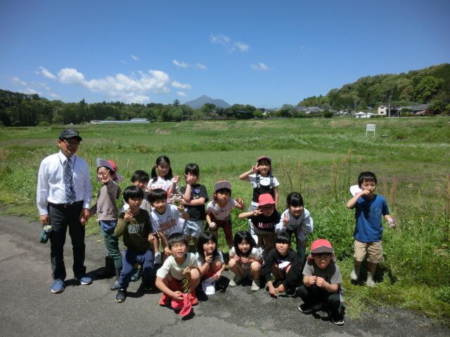 霧島の山をバックにパチリ!とっても楽しい探検学習でした。