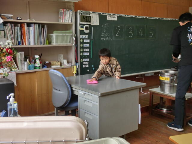 1年生の給食が始まって1週間が経ちました。もうだいぶ慣れてきたようです。台ふき係さんが、もうしっかりお仕事していました。えらいなあ。