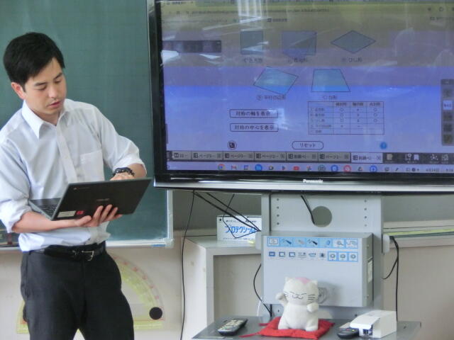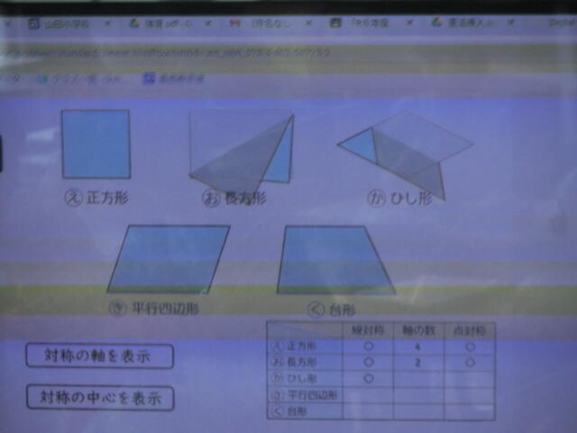 今日は、6年生の算数の様子を見に行きました。担任が新しいデジタル教科書を使って、対象な図形について説明しているところでした。