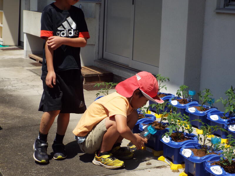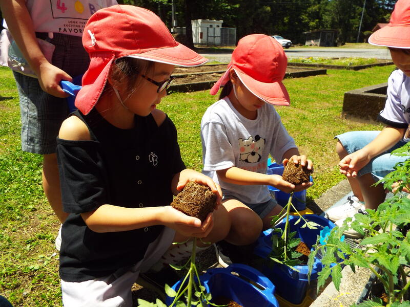 今日は2年生が、生活科の学習でミニトマトの苗を植えました。