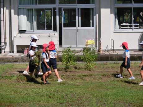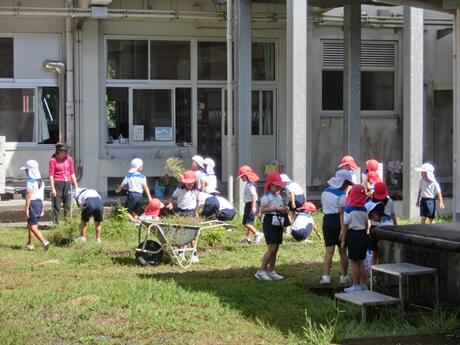 1年生と2年生が一緒になって夏休みの間に伸びた雑草や枯れた夏の花の片付けをしていました。