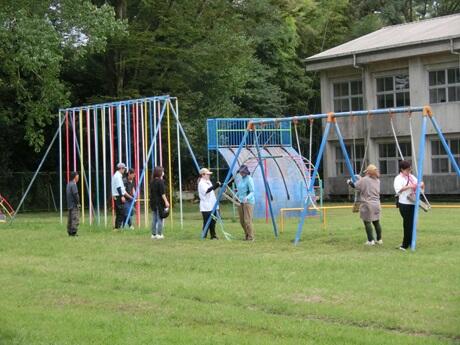 保護者の方も手伝いに来てくださり、観覧席のロープを張ったり、遊具を使用禁止にしたりと準備を手伝ってくださいました。