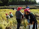 10月3日(月) 朝晩は過ごしやすくなってきましたが、日中はまだまだ日差しが強く照りつけています。そのような中、3校時から4校時にかけて、4・5年生が稲刈りをしました。今回もYYクラブの方々が事前に畦を払ったりして、子どもたちが活動しやすいように準備をしてくださいました。台風14号の影響で多くの稲が倒れていましたが、ひと株ひと株起こしながら、2人ペアで交互に稲を刈っていきます。初めて稲刈りをする4年生は、初め力の入れ具合がわからない様子でしたが、次第に鎌の扱いが上手になっていきました。2年目となる5年生は、さすがに手際良く刈っていました。毎年米作りの準備から管理までお世話くださっているYYクラブの皆さんに感謝しつつ、今日の体験を心に留めてほしいと思います。