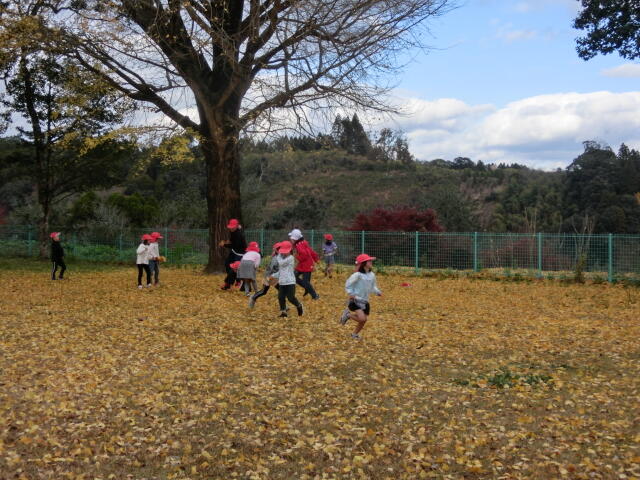銀杏の葉が運動場にたくさん散っていて、まるで黄色い絨毯のようです。