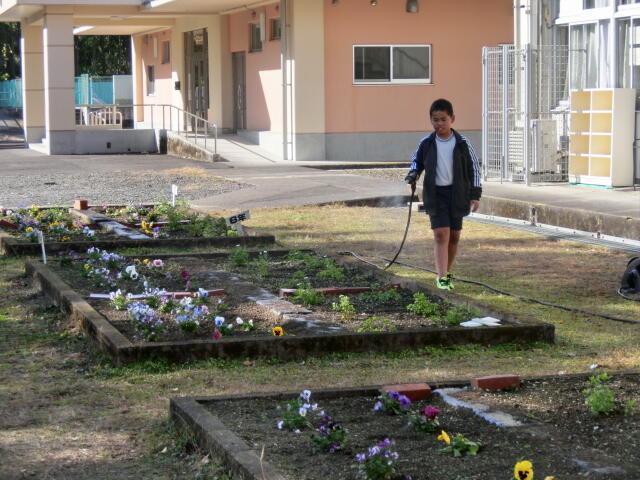 よく見ると、6年生の花壇だけでなく、周りの花壇にも水をあげています。「係の仕事なの?」と質問すると、「いいえ、好きでやってます。ぼく、水やり好きなんです。」という答え。なんて素晴らしい!感動しました。誰も見てないのに、好きで植物に水をあげるって素敵です。