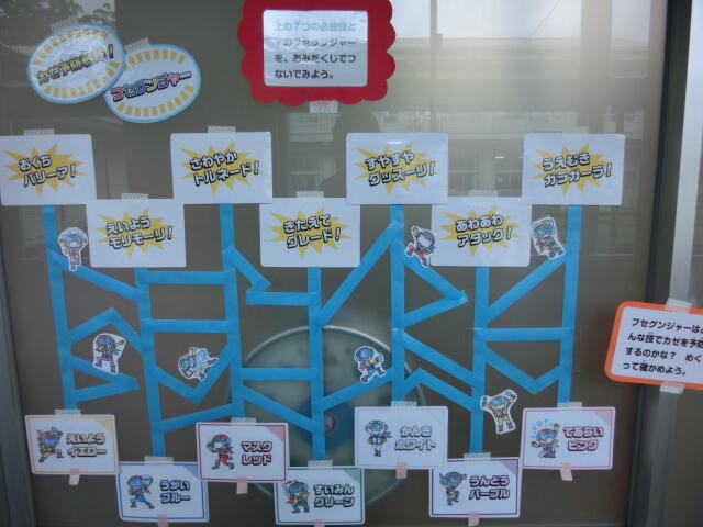 これは、保健室前の掲示板です。おもしろい戦隊ものです。