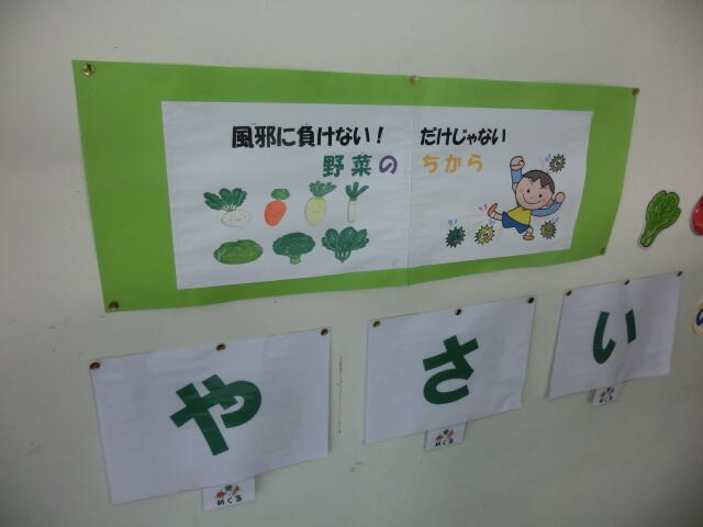 「やさいのちから」です。一枚一枚めくっていくと、野菜の大切さが分かるようになっています。風邪をひきやすいこの時期だからこそ、野菜をしっかり取ることは大切です。先週から比べると欠席者の数は減ってきましたが、寒さはまだまだこれからが本番です。子どもたち、野菜をしっかり食べましょうね!