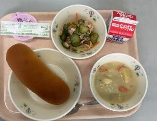 黒糖パン クリームシチュー ハムサラダ お祝いいちごゼリー 牛乳