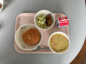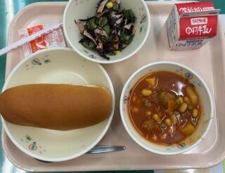 黒糖パン かぼちゃグラタン アーモンドサラダ 豆入りミネストローネ 牛乳