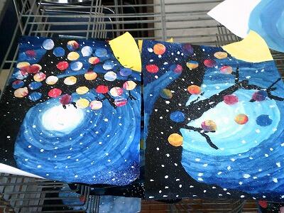 3年生が図画工作で絵を描いています。どれもとても神秘的な雰囲気です。よく見てみると、背景はグラデーション、降る雪は点描だけでなくスパッタリングも、色とりどりの明かりはコラージュといろいろな技法を取り入れたようです。仕上がった児童の作品からは、どれも丁寧で集中して絵を楽しんだ様子がうかがえました。