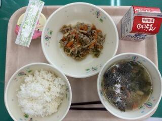 ごはん イワシのみぞれ煮 県産高菜漬けの油炒め 鶏肉と大根のみそ汁 福豆(黒糖) 牛乳