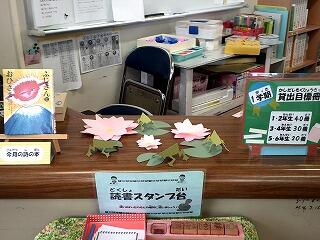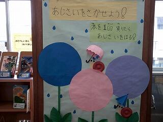 図書室が6月に向け、イベント装飾や展示コーナーを新しくしています。委員会選定のむし歯予防に関する書籍コーナーや貸出冊数をあじさいの花で表示するものなど季節に合わせた工夫がされています。年間貸出し1万冊を目標に5月から活動をスタートさせ、1か月で貸出し1000冊をこえ、順調のようです。梅雨の時期、室内で過ごす時間の使い方の一つとして読書が定着するといいですね。