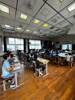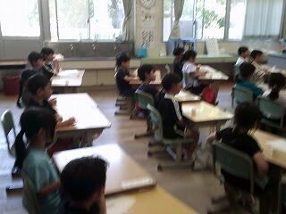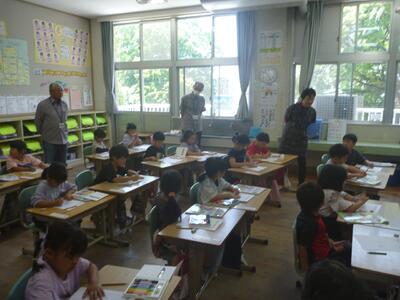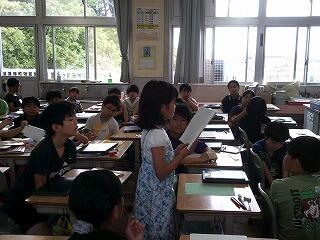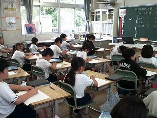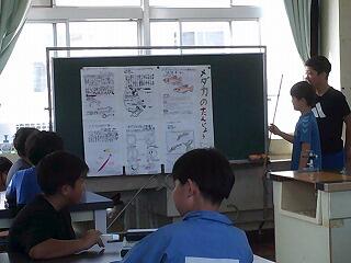 5年生の理科ではメダカについて調べたことを発表していました。メダカの雌雄の見分け方や正しい飼い方、成長の過程など一人一人がテーマをもって調べていました。一人一人のまとめは見出しに沿った内容を箇条書きで表したり、説明に必要な部分を大きな図で表したりととても見やすい構図で表現されていました。発表から、それまでの準備も班で協力し合い、助け合って臨んでいる様子がうかがえました。