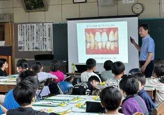今週はむし歯予防週間です。3・4年生は、学校歯科医の常盤先生による歯科保健指導がありました。歯の構造やむし歯の成り立ち、歯みがきの仕方、むし歯になりにくいおやつの食べ方などを学習しました。80歳まで健康な歯を20本以上保てるように、毎日の歯みがきを頑張ってほしいと思います。