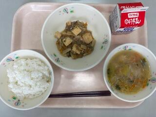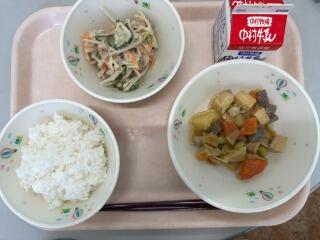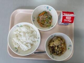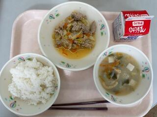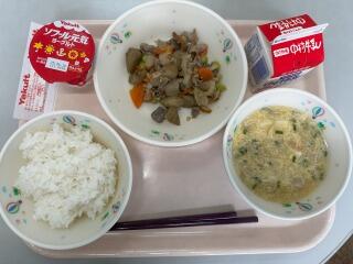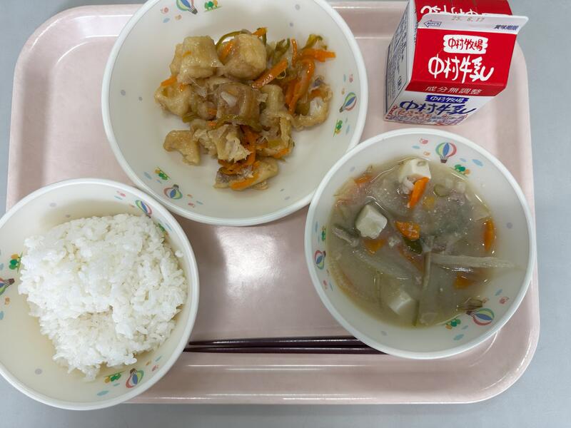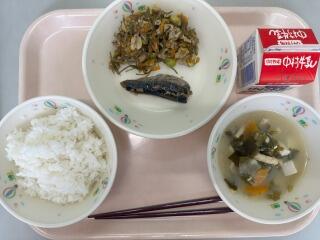ごはん いわしのかぼすレモン煮 豚肉ときざみ昆布の炒め物 大根と油揚げのみそ汁 牛乳