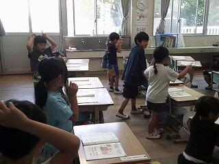 1年生の教室から「でんでんむしむしかたつむりー」と楽しそうな歌声が聞こえてきます。見てみると歌に合わせて振り付けを作っているようです。隣の友達をペアになって話し合いながら動きを決めているようです。何度か練習した後、考えた振り付けを披露していました。歌詞とリズムにに合わせて同じ動きやタイミングをずらすなど工夫もしているようです。聞く側も手拍子で応援しながら楽しそうに歌声で応援していました。