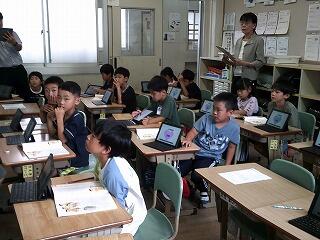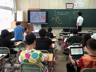 この日は、初期研修者への模範授業で6年生の教室で道徳の学習が行われていました。タブレットに自分の考えた気持ち等を打ち込んでいます。打ち終わった児童は、画面上で友達の考えを見て、自分の考えと比べ、思いを確かにしたり、更新したりします。以前は発表しないと友達の考えは分かりませんでしたが、タブレット使うことで多様な考えに触れることができるます。これも、タブレットの利点の一つですね。