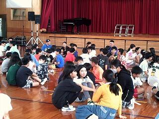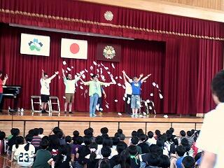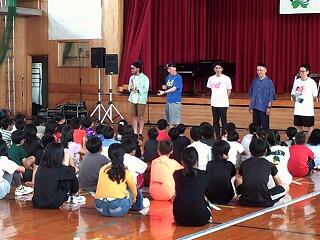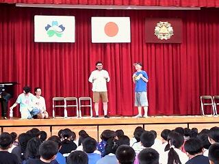 6月13日(金)に鑑賞教室を行いました。今回は市の事業の一環で「ロクディム」による演劇のワークショップや即興演劇と児童も一緒に楽しめる演目でした。即興演劇では児童が事前に書いたメモをステージにばらまき、劇をしながら時々そのメモを拾い、そこに書かれた台詞を使って話を展開するものでした。台詞がはまって面白いものや場面と合わず、それがかえってコミカルに感じられるものもあり、子どもたちの楽しい笑い声が響く鑑賞教室となりました。