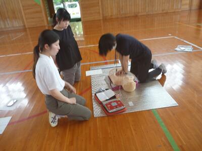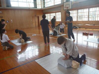 6月13日(金)にプールが始まる時期になったので、児童の命を守るために救命の研修を行いました。まずは、心肺蘇生法の練習を行いました。今年度は、周りに人がおらず1人で様々な対応を考える研修も行いました。また、熱中症、誤嚥の対応についても研修をしました。