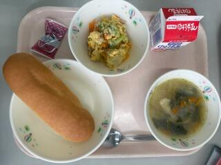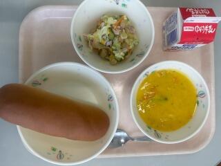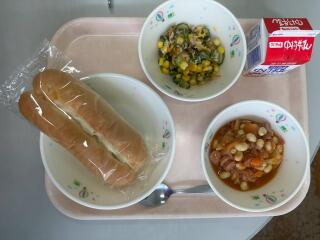 コッペパン ベーコンと野菜の卵とじ ラビオリスープ マーシャルビーンズ 牛乳