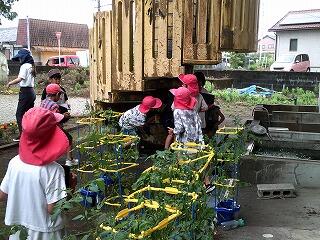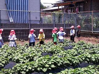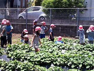 1,2年生は生活科の学習で一人一鉢の栽培をしています。毎朝、水やりをして、生長や変化を喜んでいます。この日はそれに合わせて、自分たちで1か月前に学校の畑に植えたサツマイモを観察しました。子どもたちはたくさんの葉を広げたサツマイモの生長、変化に驚きの声を上げていました。元気のよい緑の葉を見ると、秋の収穫が楽しみです。
