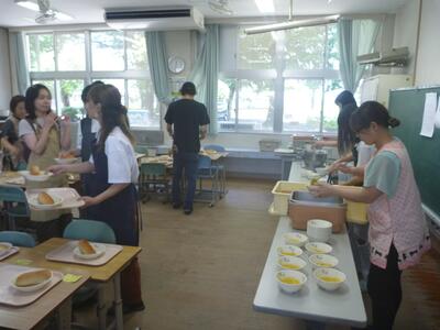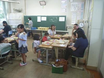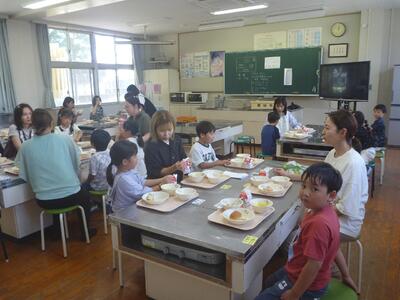 人権教育の後は、家庭教育学級生を中心に給食試食会の準備を行い、1年生の子ども達と一緒に楽しく給食をたべました。