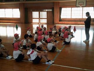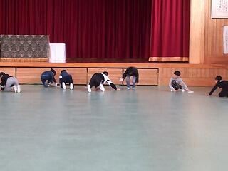 3年生の体育の学習です。この日は、いろいろな動きで体をほぐしたり、俊敏に体を動かす活動をしていたようです。この時は、フロアにうつ伏せになり、2人一組になって向かい合っていました。それぞれに追いかけるときと逃げるときのキーワードがあり、それが聞こえたらさっと体を起こし、一方は追いかけ、もう一方は逃げ始めます。キーワードを聞き漏らさないように体育館が静まり、キーワードとともに動作音と歓声がわきあがります。とても楽しそうに取り組んでいました。