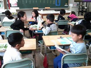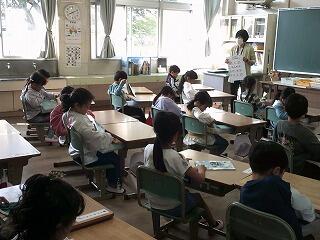 校舎の2階から歓声が聞こえます。声の元をたどると4年生の教室からでした。この時間は外国語活動の時間で世界各地のあいさつについて学習しています。その時間に学習したこと元にゲームが行われていました。キーワードが出たら友達より早く、二人の間においてある消しゴムをとるなゲームです。次々出てくる言葉をしっかりと聞き分けるための息をのむような静けさと、キーワードが出た瞬間の消しゴムを取る音と歓声の響きが対照的でした。