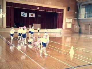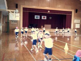 体育館から元気のよい足音が聞こえてきます。中では2年生が体育の学習をしています。4人組で列を作り、走りながら先頭の人の動きをまねするようです。腕を回したり、スキップしたり、テレビのCMで見るようなコミカルな動きをしたり、転がったりと動きは様々です。しばらくすると「交代」の声、すると先頭が入れ替わり、また、先頭の動きに合わせてまねをしながら走ります。たくさんの運動量で息は上がっていますが、表情はみんな楽しそうでした。