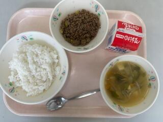 麦ごはん 肉そぼろ丼の具 ちんげんさいともやしのスープ 牛乳