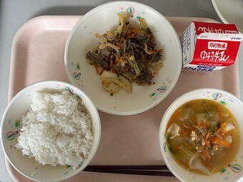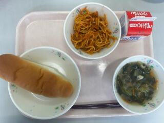 ミルクパン ミートソーススパゲティ 野菜スープ 牛乳