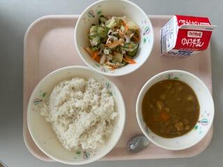 麦ごはん チキンカレー 日向夏ドレッシングサラダ 牛乳