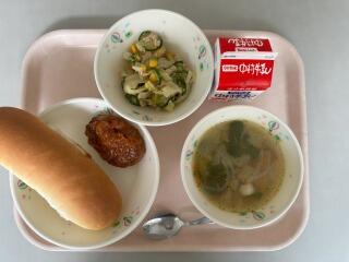 マヨネーズパン 春雨のピリ辛炒め 中華コーンスープ 牛乳