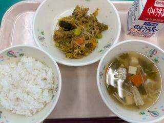 麦ごはん 豆入りドライカレー わかめスープ 牛乳
