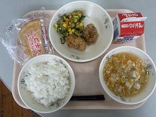 減量ごはん 鶏の唐揚げ コーンサラダ かきたま汁 いちごクレープ 牛乳