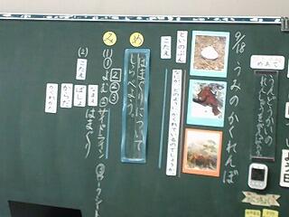 1年生が国語科で説明的文章の学習をしています。ハマグリを題材とした部分でした。「なまえ」「ばしょ」「からだ」「かくれかた」の順にキーワードを探していきました。また、今回は定規を使ってサイドラインを引く練習も兼ねていました。今後、少しずつ慣れて、いつかは、自分で大事な言葉を見付けられるようになり、さっとサイドラインが引けるようになるでしょう。さらに、説明的文章にあるひみつ(筆者の伝えたいこと)を見付けられるようになると、いろいろな本に書いてあることの出会いや驚きが更に大きく、深くなることでしょう。
