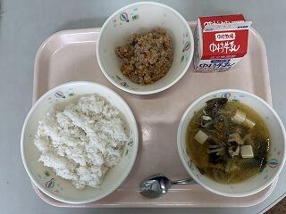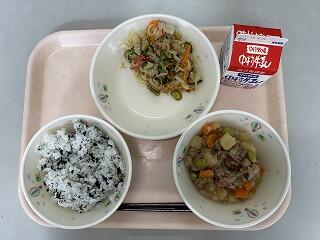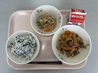 わかめごはん きゅうりとキャベツの中華和え じゃがいもと豚肉のそぼろ煮 牛乳