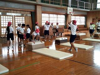 4年生が体育館で跳び箱運動の学習をしていました。側転や台上前転の練習、閉脚跳びの部分練習も取り入れていました。いろいろな技に数多く練習できるよう、フロアいっぱいに跳び箱やマットが配置されていました。活動後はみんなで協力して、安全に片付けをしていました。