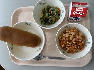 黒糖パン ポークビーンズ レモン和え 牛乳
