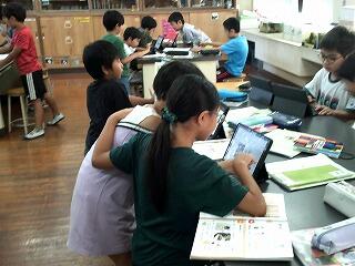 4年生が社会科学習で郷土の文化や歴史をタブレットで調べていました。自分の興味のある題材についてタブレットで調べ、その情報をもとにプレゼン資料まで作成するようです。みんないろいろな情報を渡り歩き、分からないことは互いに聞いたり、作成の進め方を教え合ったりしてるようです。みんなで互いのよいところを見合って、自分で納得のいく仕上がりになるといいですね。