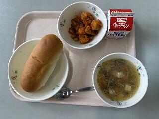 チーズパン タラチリソース もやしの中華スープ 牛乳