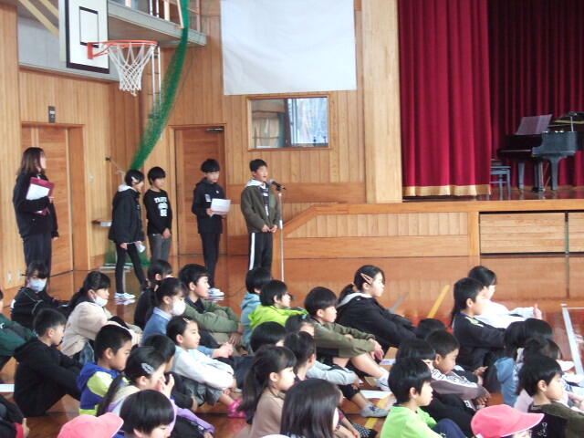 お別れ集会では、6年生を送る会を児童運営委員会進行のもと実施しました。6年生への感謝の気持ちを込めて、各学年ごとに発表しました。合奏あり、合唱あり、コントあり、クイズあり、プレゼントありの趣向を凝らした発表ができました。6年生もお礼の発表をしてくれました。この会を通じて、6年生の存在がとても大きかったことや、6年生の後ろ姿を見ながら次の6年生が育っていくことの素晴らしさを感じる会となりました。中霧島小学校の卒業生として胸を張って中学校に入学してほしいと思います。