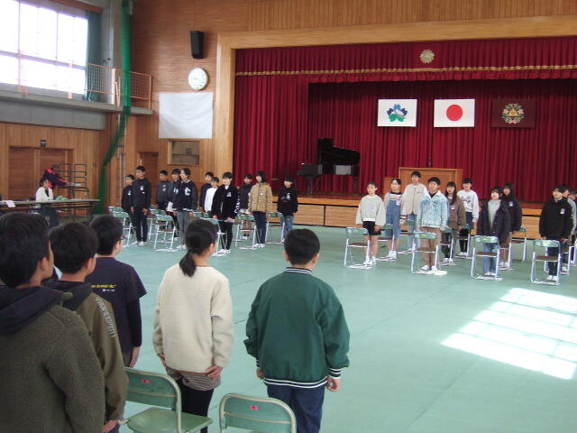 3月25日の卒業式に向けて、4年・5年・6年生が第1回目の練習に参加しました。卒業式に向けての心構えや会の大まかな流れの説明を行いました。また、起立や着席のタイミングや礼の仕方等についても確認しました。ちょっぴり緊張気味の時間となりました。