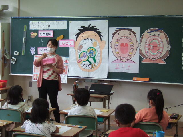 歯の衛生週間の一環として、2年生で歯の健康に関する授業を計画しました。養護教諭が色々な資料を使って、むし歯予防のために必要なことを児童に考えさせました。