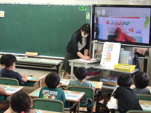 6月15日(水)1年生の教室で算数の研究授業を行いました。たし算の学習で、大型テレビの画面を見ながら問題文の「ふえる」の意味を確認しました。