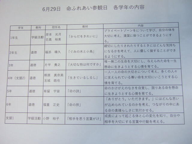 6月29日(水)の「命ふれあい参観日」では、全学年で道徳や学級活動で「命」をテーマにした授業を行いました。各学年の発達段階に応じて、「命」について考える時間になりました。